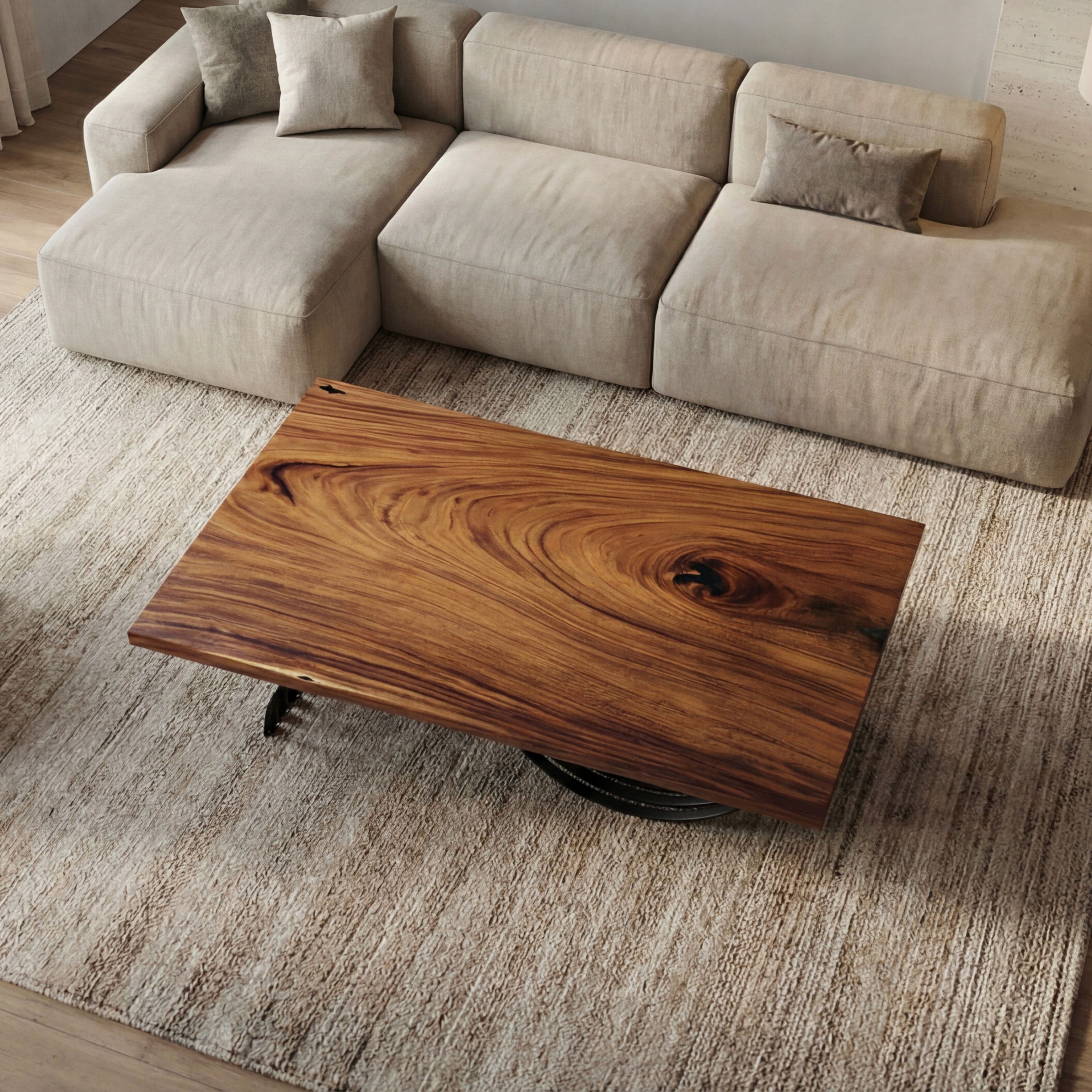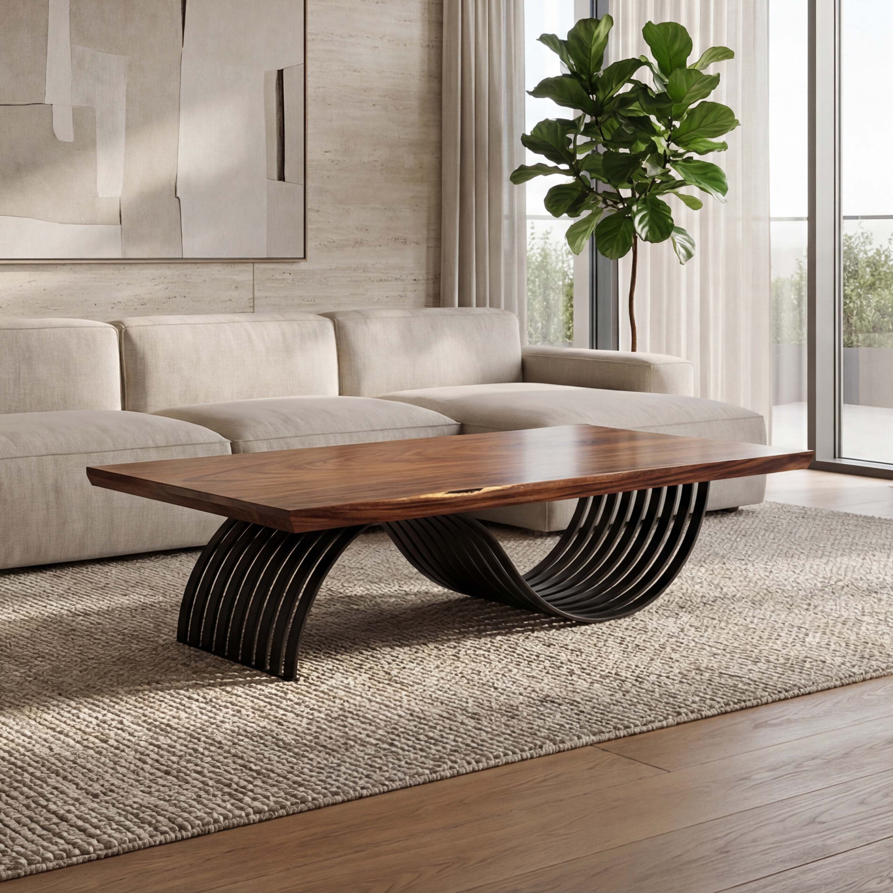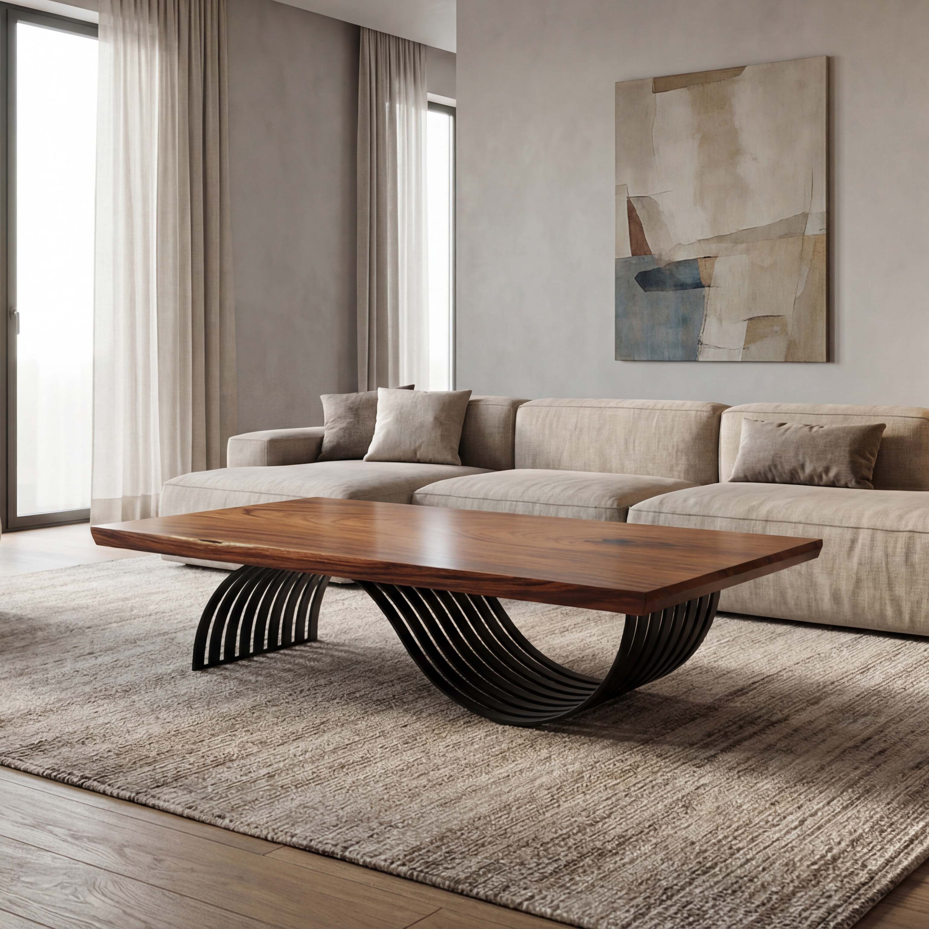 The Catania Coffee Table is a true statement of luxury, combining the natural richness of European walnut with a bold modern aesthetic. Crafted from a single hardwood slab, its deep brown tones and striking grain patterns bring warmth, character, and timeless elegance to any interior. The sculptural steel base introduces a contemporary edge, creating a harmonious contrast between organic beauty and modern design.