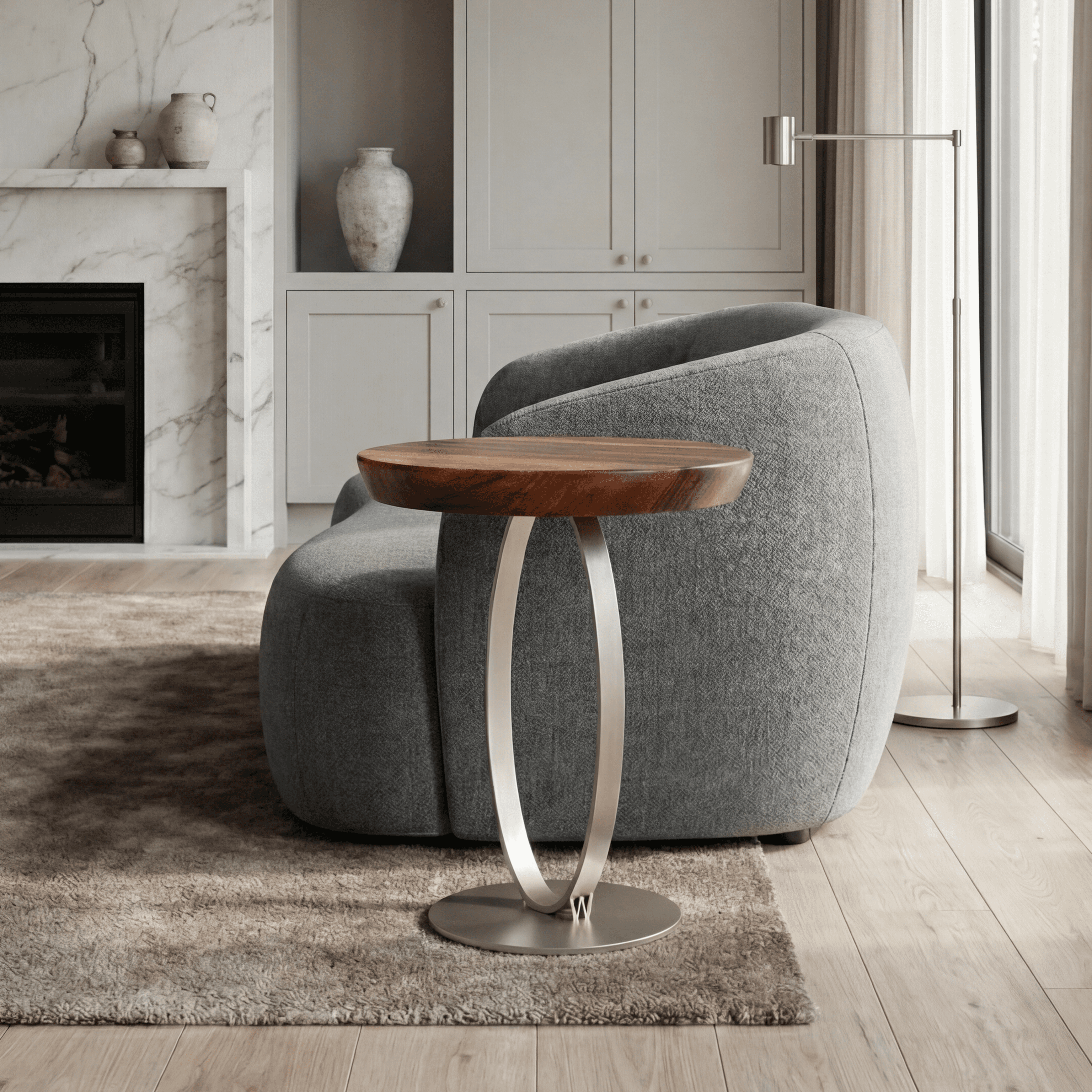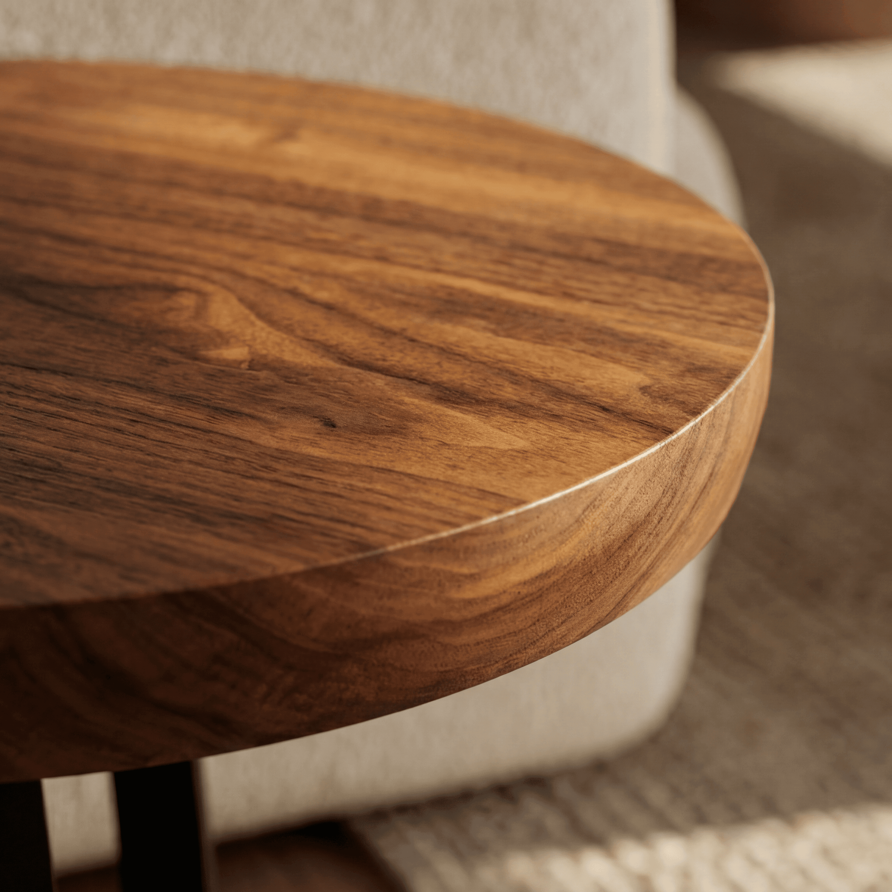 Lisbon side table is a round side table made of natural European Walnut slab wood top and steel powder coated base with different options of top edge finishing and base color The Lisbon side table combines valuable materials and finishes for a restrained and elegant design capable of offering new aesthetic-functional solutions. Both elements, top and base, have rounded geometries that give a sense of solidity and lightness